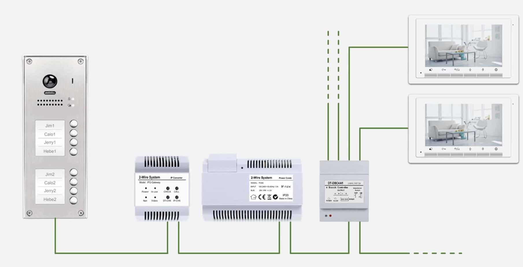 Die gemeinsame Türstation ist in der Lage alle Indoor-Monitor in jeder Villa anzurufen da sie zum Netzwerk gehört , und jedes 2-Draht-Subsystem (Einfamilienhaus) ist aus dem Netzwerk isoliert Backbone-Bus durch das IP-Gateway.